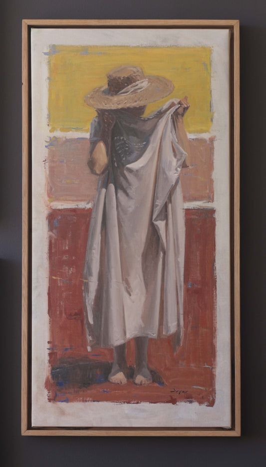The figure is simple, static, and beautiful—and barely tense. She is seen from the back and the slightest edge of her eyelashes show that her eyes are open. When the painting is folded from right to left to reveal the other side, she appears the exact same, only mirrored. At play here are ideas of manipulation, beauty, perception, and control.