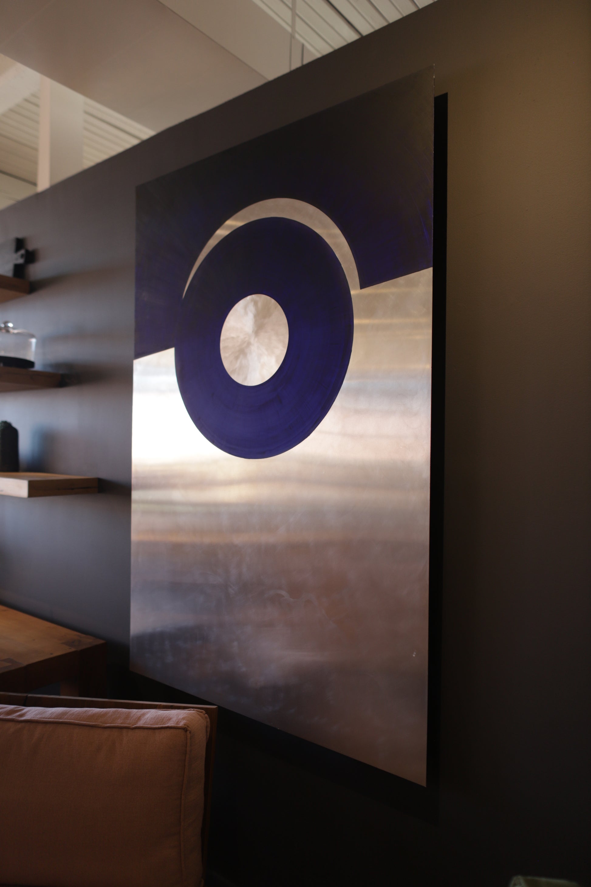 This work is an attempt to speak of many things in distilled terms. Visually, it’s just an aluminum circle inside a blue circle that has been rolled away from a large shape.